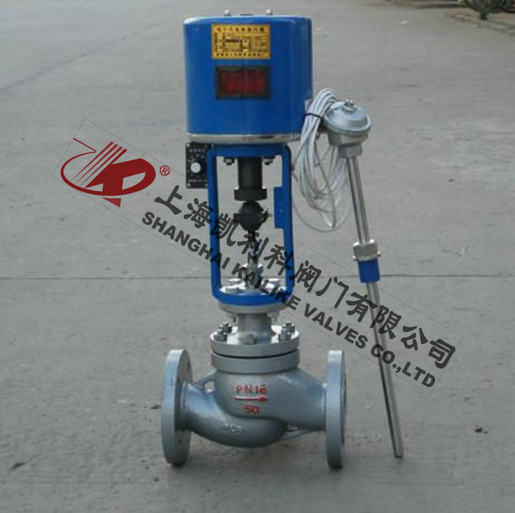 由單座調(diào)節(jié)閥、電動(dòng)執(zhí)行機(jī)構(gòu)、溫度傳感器和溫度調(diào)節(jié)器等部件組成,根據(jù)用戶需要,分別有加熱型與冷卻型兩種結(jié)構(gòu)。加熱型調(diào)節(jié)閥的結(jié)構(gòu)與原理,工作前主閥芯處于半開位置,傳感器處于自然狀態(tài)。接上電源,主閥芯全開。介質(zhì)由箭頭方向流入主閥體、經(jīng)閥芯對(duì)儲(chǔ)熱箱進(jìn)行加熱。當(dāng)溫度升到相應(yīng)設(shè)定值時(shí),傳感器即產(chǎn)生相應(yīng)線性信號(hào)輸入一體化執(zhí)行機(jī)構(gòu),隨即驅(qū)動(dòng)閥桿、閥芯產(chǎn)生位移,關(guān)閉主閥芯停止加熱。當(dāng)溫度低于設(shè)定值時(shí),傳感器即產(chǎn)生線性信號(hào)輸入一體化執(zhí)行機(jī)構(gòu),驅(qū)使閥芯漸開,使介質(zhì)按拋物線特性流入儲(chǔ)熱箱,進(jìn)行加熱直至設(shè)定值。這樣被控介質(zhì)始終在設(shè)定溫度范圍內(nèi)被控制,從而達(dá)到控溫目的。