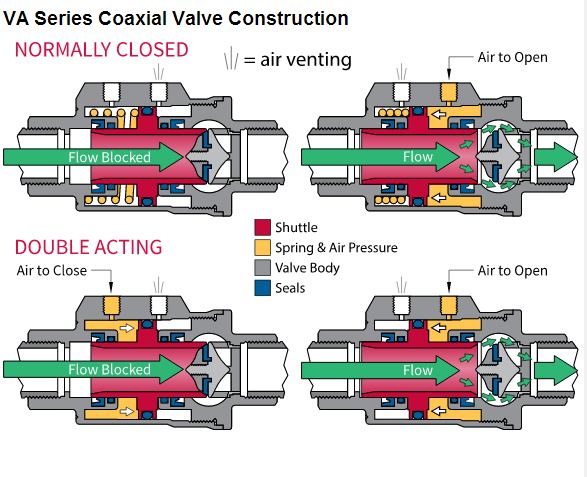 閥2同軸的位置,閥可以是氣動(dòng)或電動(dòng)地驅(qū)動(dòng)。電動(dòng)版本使用電磁線圈和彈簧,類似于螺線管閥。該版本使用氣動(dòng)空氣壓力和彈簧(彈簧復(fù)位),或空氣壓力在兩個(gè)方向(雙向)。使用同軸閥往復(fù)型障礙物,穿過介質(zhì)時(shí)打開。該傳送裝置移動(dòng)到一個(gè)位置或另一個(gè)來執(zhí)行其功能,或者開/關(guān)或分流流量到適當(dāng)?shù)某隹凇MS閥(10)具有更大的流動(dòng)通道的電磁閥相比,但仍然沒有完全的閥端口。那是真的,又有一個(gè)限制流量和壓力損失的增加。有風(fēng)格多樣的同軸閥。兩個(gè)例子是VA系列氣動(dòng)操作閥的開/關(guān)VAX系列電動(dòng)或氣動(dòng)同軸閥可在2-3開/關(guān)方式或雙向分流。對(duì)于許多應(yīng)用同軸ON/OFF閥使代替球形閥。同軸閥將提供較小的閥更快操作的球閥將典型地具有較高的流速與壓降較低。